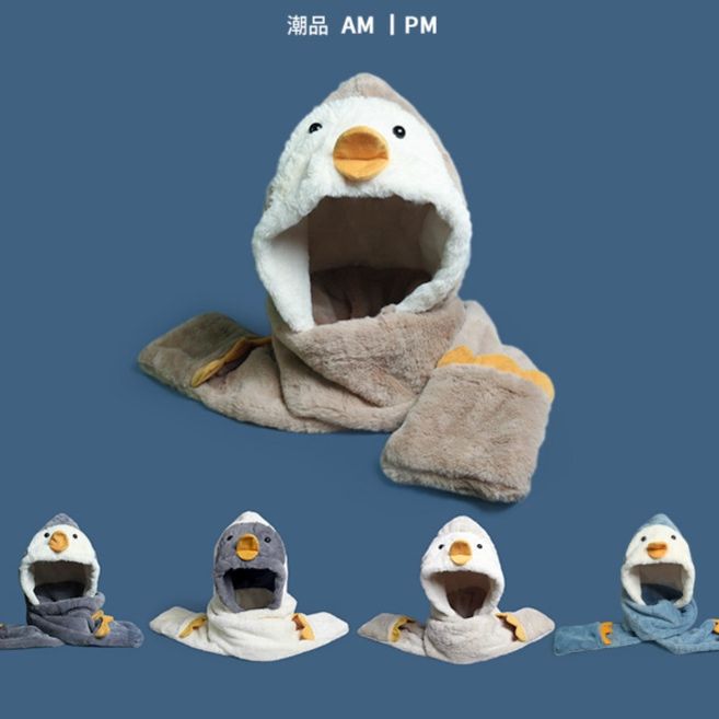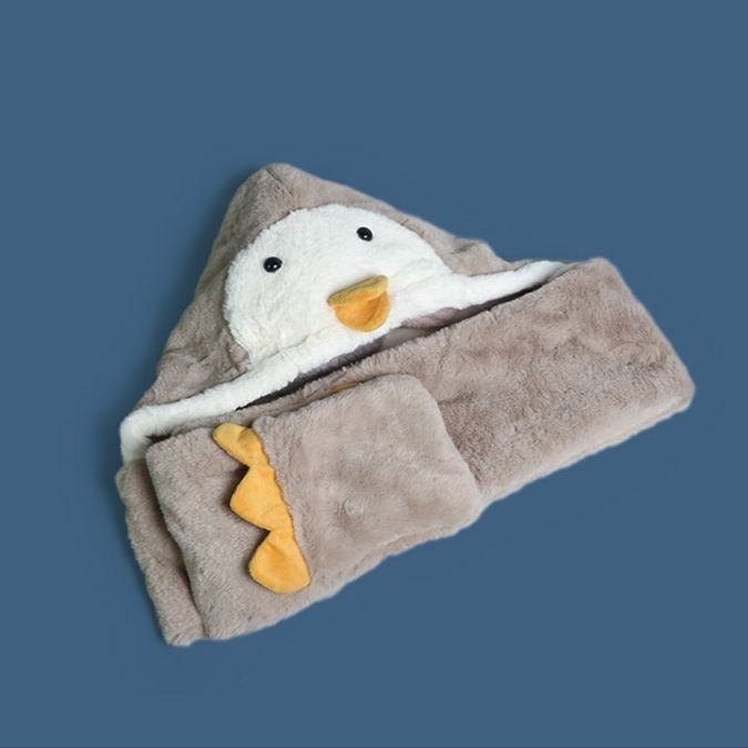 可愛らしいペンギンに変身できる帽子とマフラーが一体になった便利なペンギングッズです。 ふわふわの肌触りで寒い季節も暖かく快適に過ごせます。 帽子部分はペンギンの顔がデザインされ、マフラーには足の刺繍が施されています。 被るだけで簡単にペンギンになりきれるペンギンぬいぐるみのような愛らしさが魅力です。 お子様から大人まで楽しめる防寒アイテムとしておすすめです。